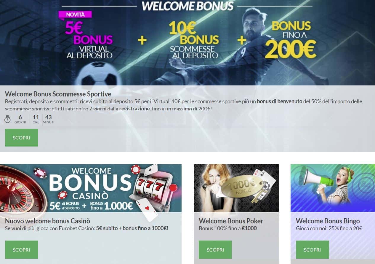 Eurobet offre un Bonus Benvenuto Scommesse di 10€ e fino a 200€ al Deposito – Virtual Sport 5€
