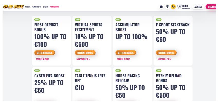 5. OhMySpins – Sito MGA con ricca sezione sportiva e promozioni giornaliere.