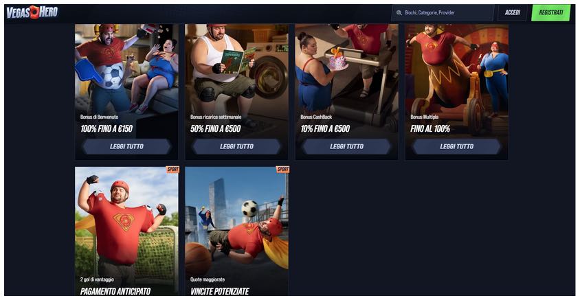 VegasHero combina scommesse sportive e casinò in una piattaforma moderna con licenza MGA, garantendo massima sicurezza e sistemi anti-frode certificati. Offre un bonus di benvenuto fino a 150€, valido anche per la sezione casinò, e supporta carte, e-wallet e bonifici con verifiche rapide.